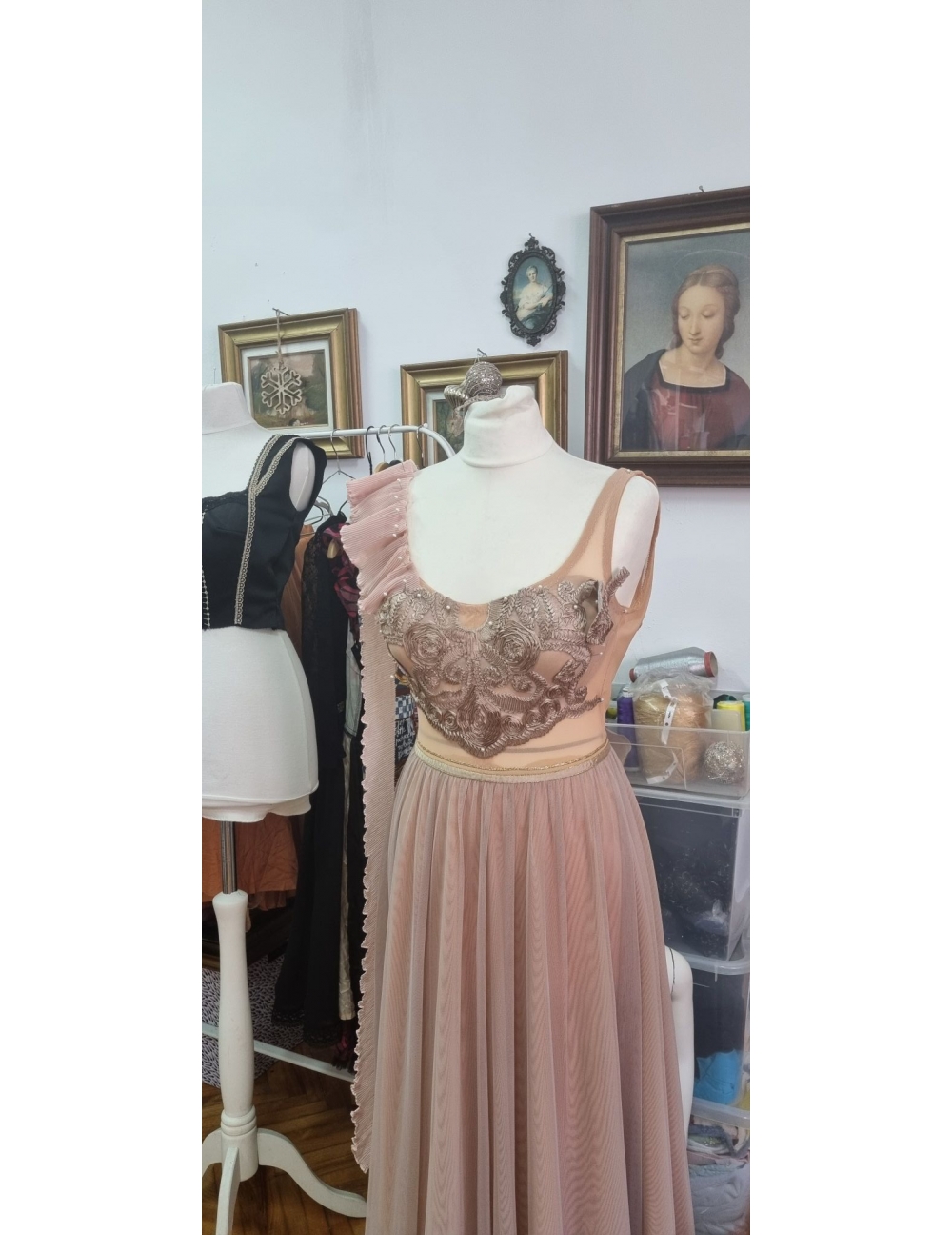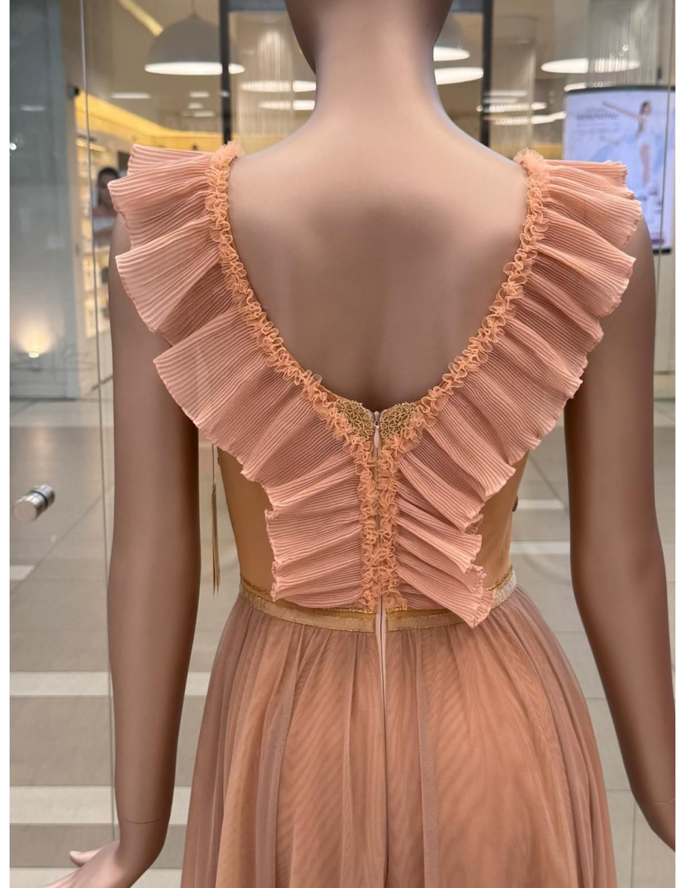 Rochie din tul cu colaj din dantela si pliseu.