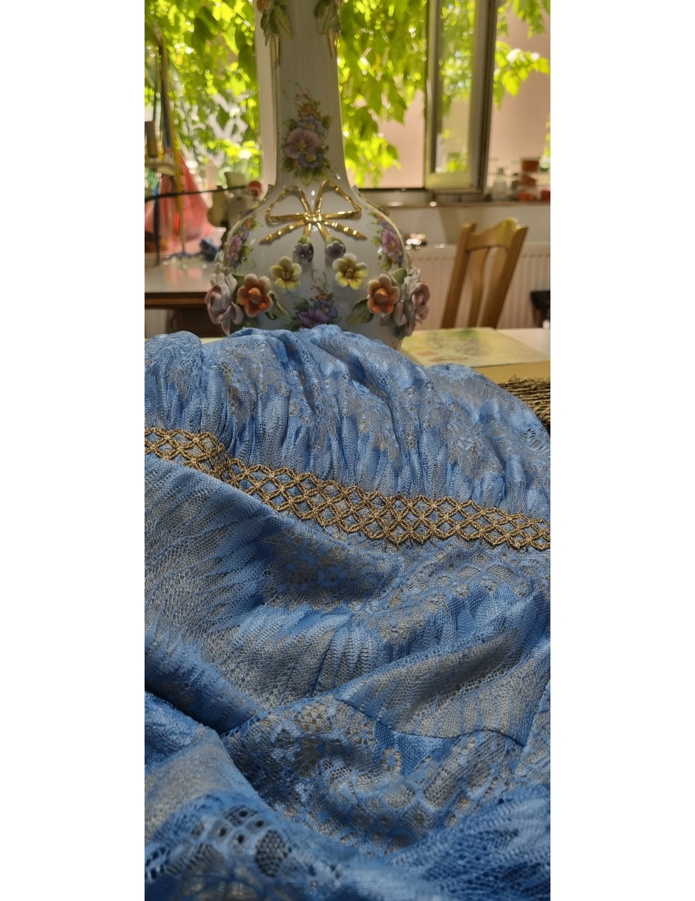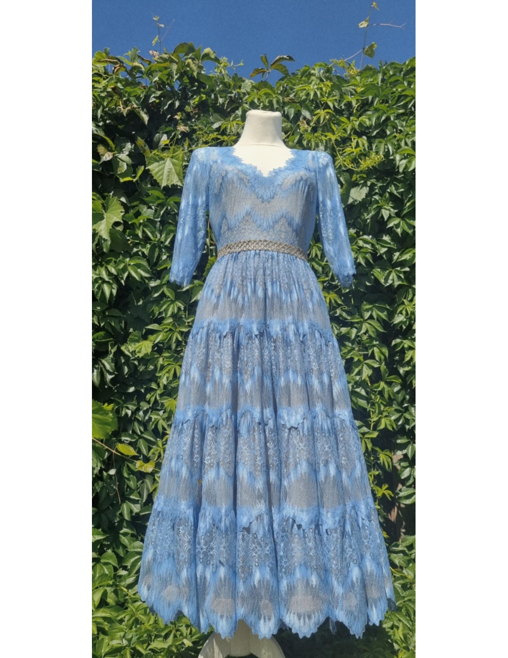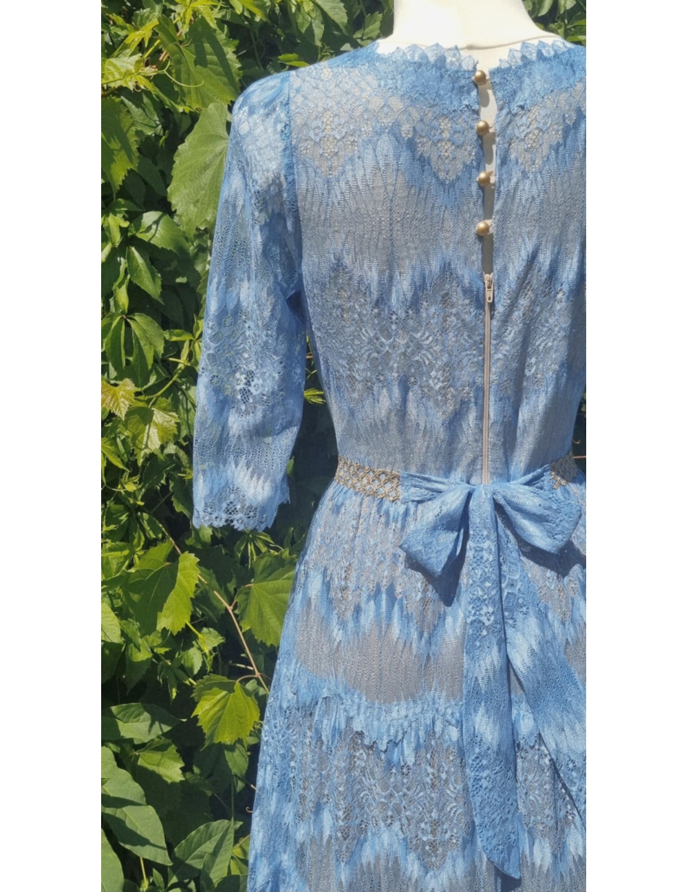 Rochie din dantela albastra cusuta pe straturi cu bej sub rochie.
